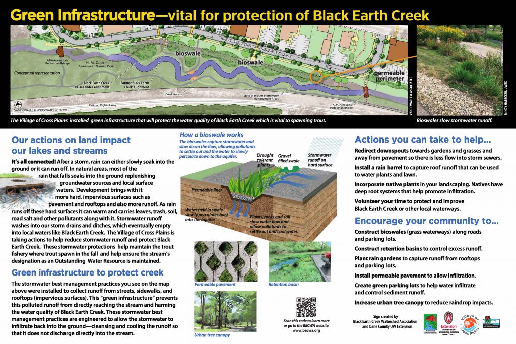 BECWA and its community partners are installing informational signs along the stream in Cross Plains, Black Earth, and Mazomanie that talk about the stream as an exceptional natural resource, the major challenges that it faces, and protection efforts. One sign (shown below), installed at H.M. Zander Community Nature Park in Cross Plains, describes how green infrastructure is being used to improve water quality and increase flood resilience.