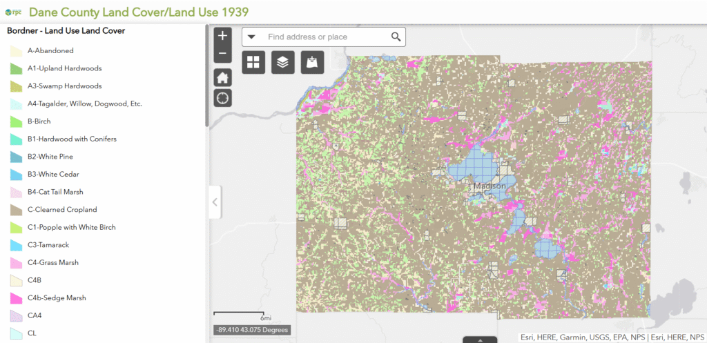 Today, CARPC uses the dataset to support regional planning efforts such as the Old Growth Forest Map and Voluntary Environmental Corridor Map, which help identify conservation and restoration opportunities across Dane County. CARPC also created the Dane County Land Use, 1939 map, using Bordner Survey data to provide a detailed snapshot of the region’s landscape at that time.